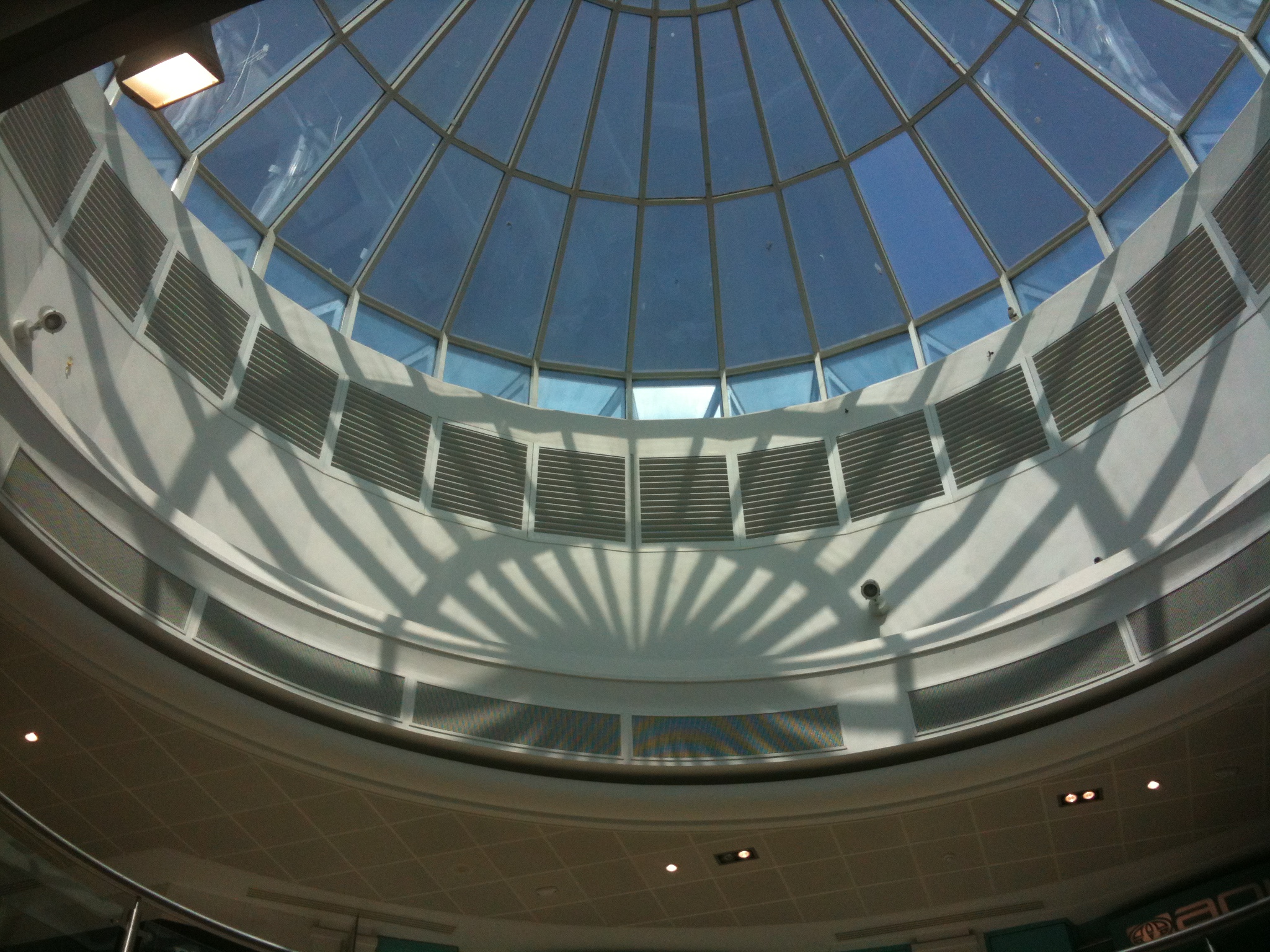 photo’d and filmed the two roof light windows. one is octagonal and strobes on the film. the arcade sounds like a swimming pool when played back.