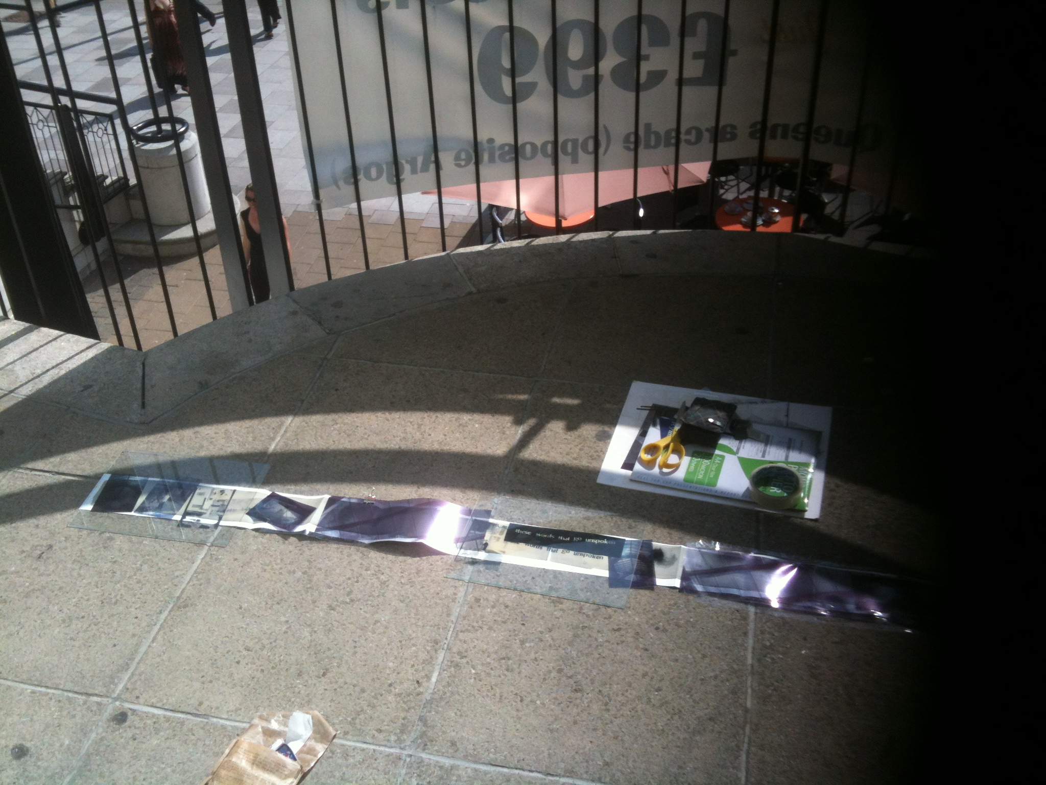 hung silk in window and projected bodymapping film onto it. it shone through onto arcade pillar. some people noticed.