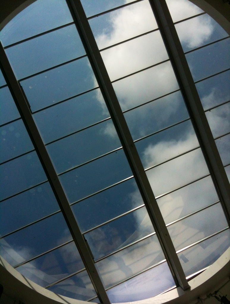 on leaving i filmed on the roof top. the quiet end of the day. blue sky and seagulls over the outside of the roof-light.