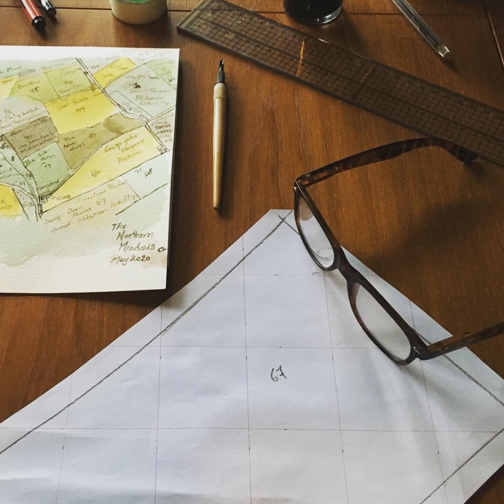 The meadow quickly became my place of calm sanity. naturally i started to look at what plants i could use for inks and dyes. Along with this, a curiosity about the area’s history and how it looked on old maps. The tithe map of 1840 just looked like a patchwork and the meadow community quilt idea was formed in my mind.
