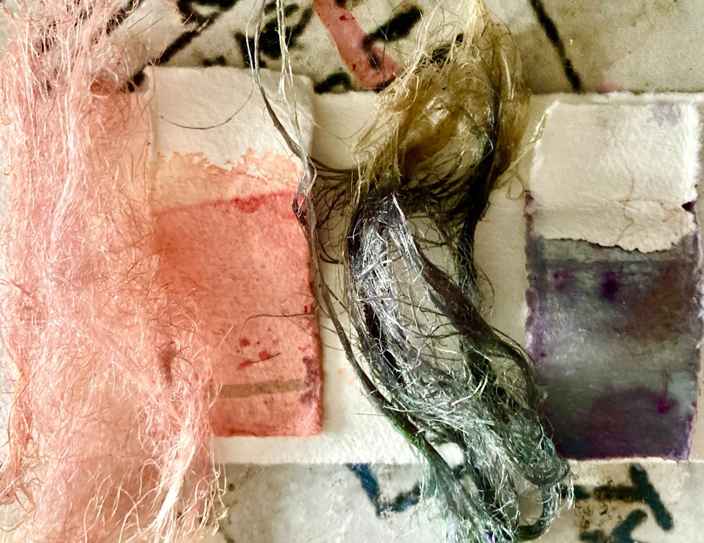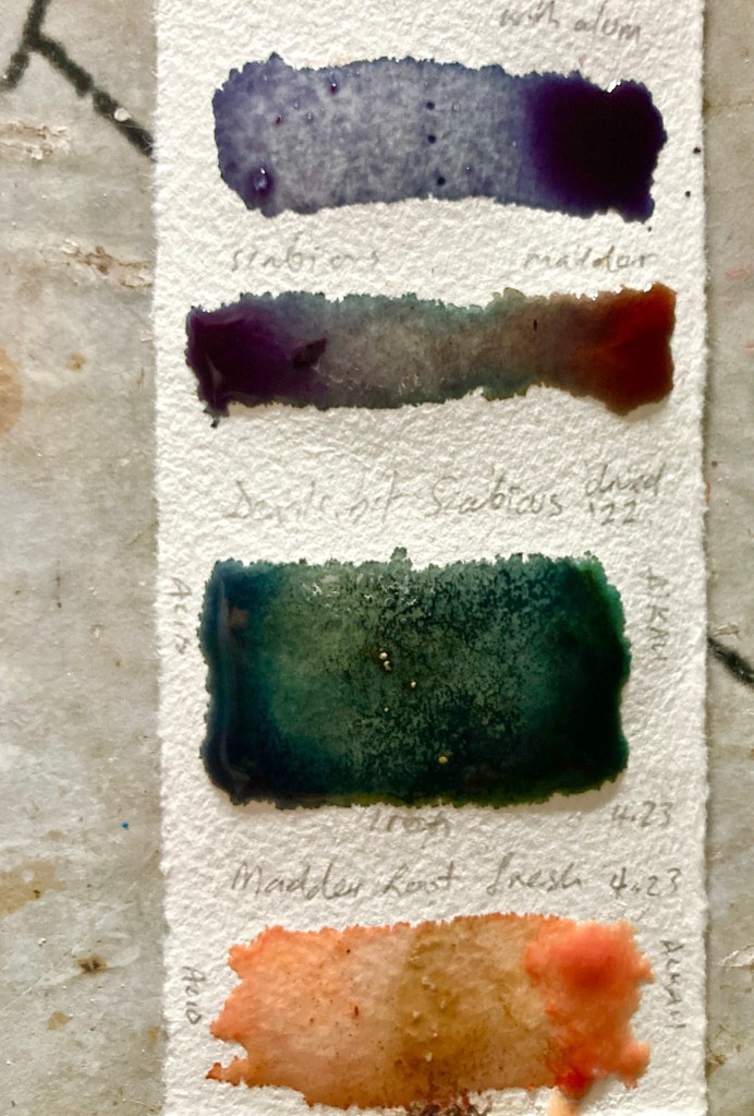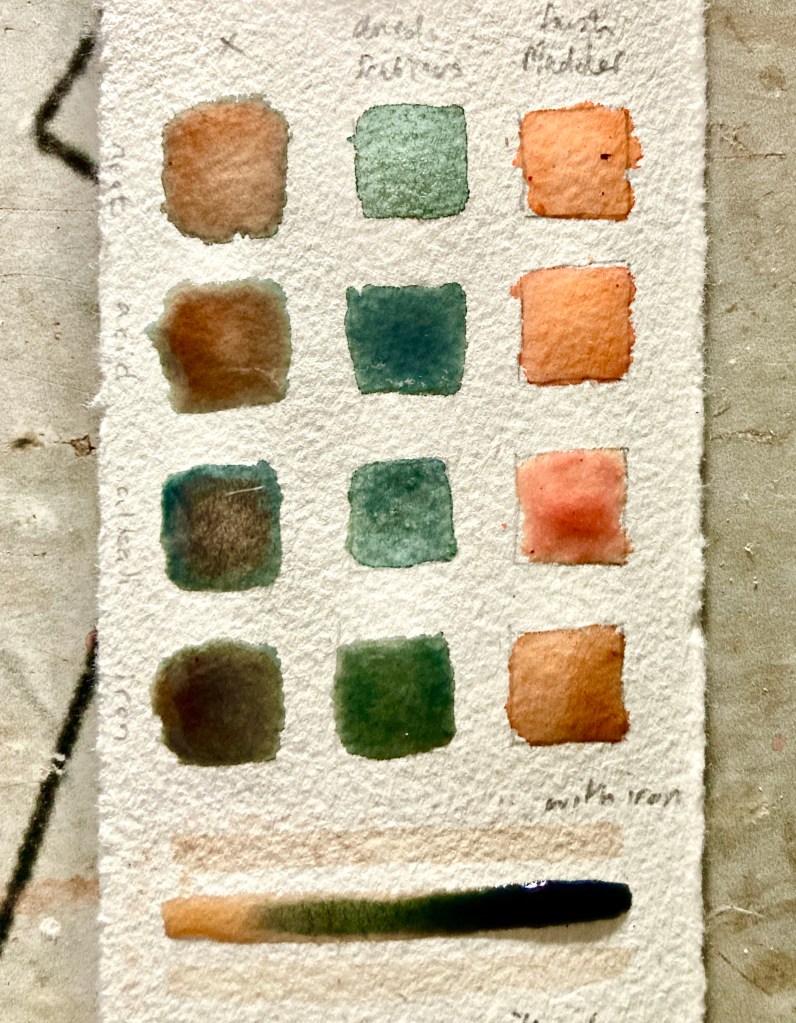 Here’s the tests done onto paper straight from the first day soaking. kept warm, not boiled. unfiltered. added the usual modifiers/mordants. I’ll make pigments from these for a painting session at gg mnm later in summer.
