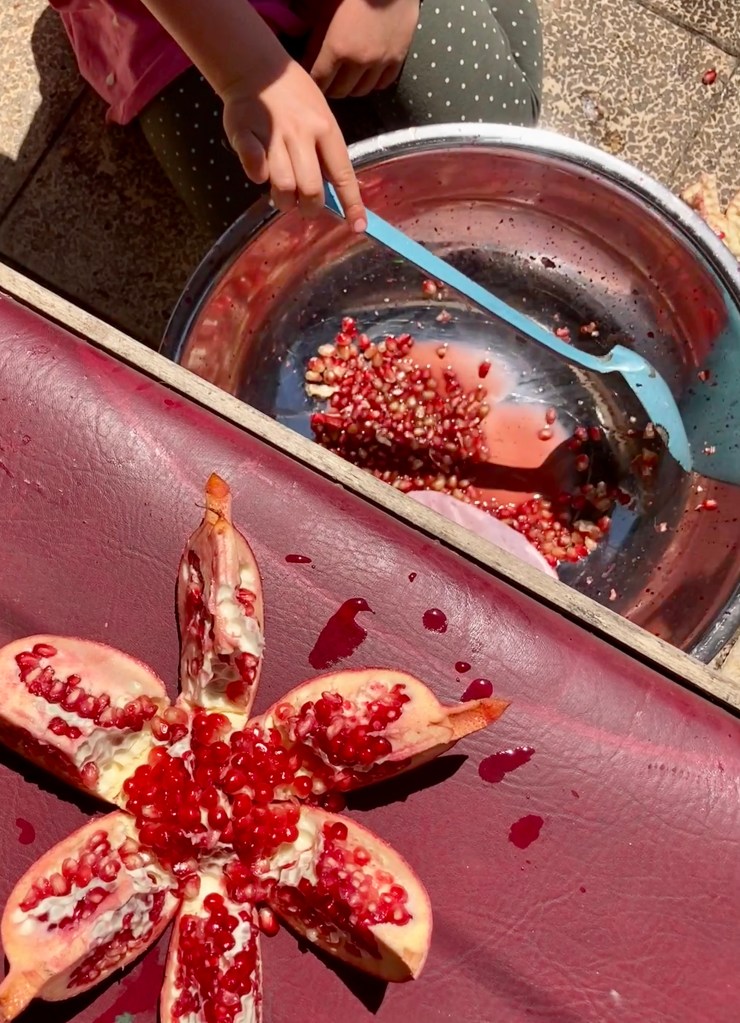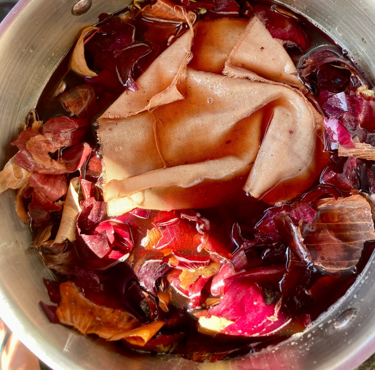 we used pomegranate, onion, cabbage, with some woad, madder, weld and iron. we did simple clamping and twisting to get pattern.