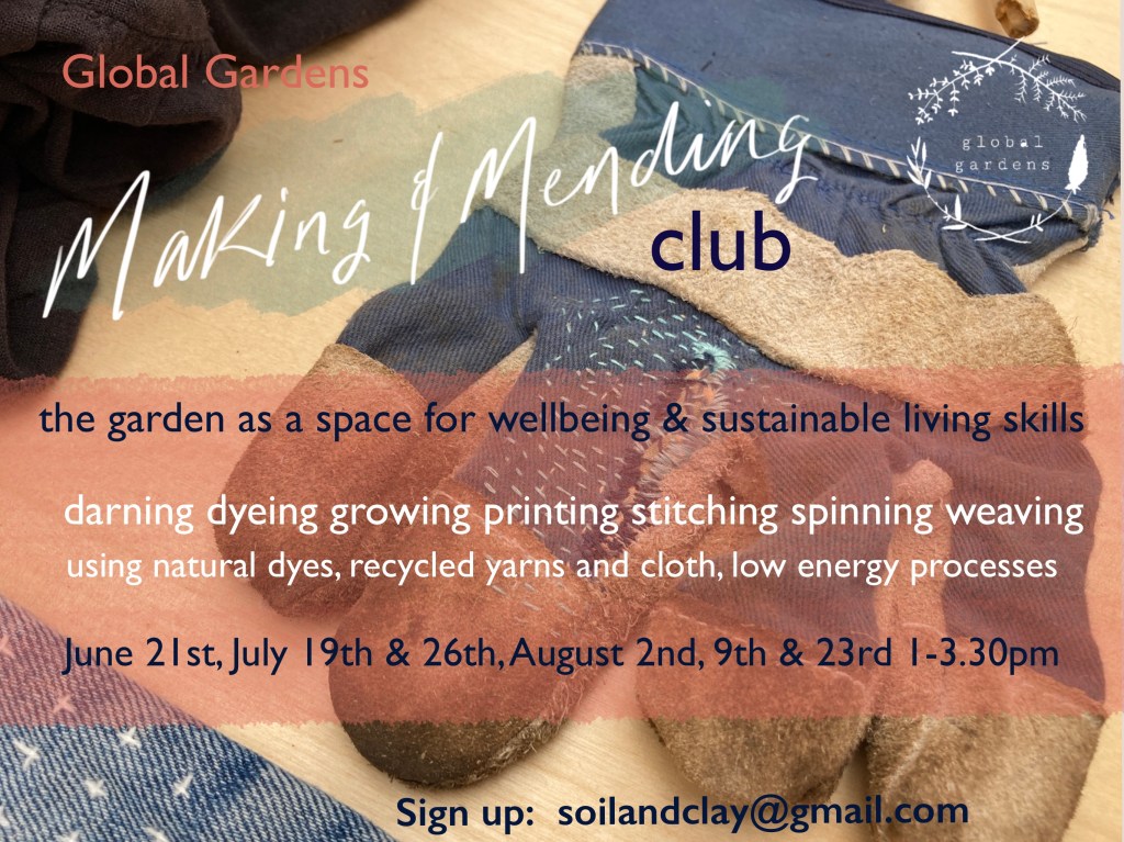 the summer season of making n mending gatherings at global gardens has started. we’ve started solar dyeing with garden plants and dye powders and we’re making a collection of samples for reference to be kept in the classroom. here’s what else is planned: