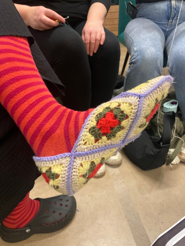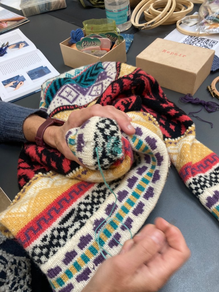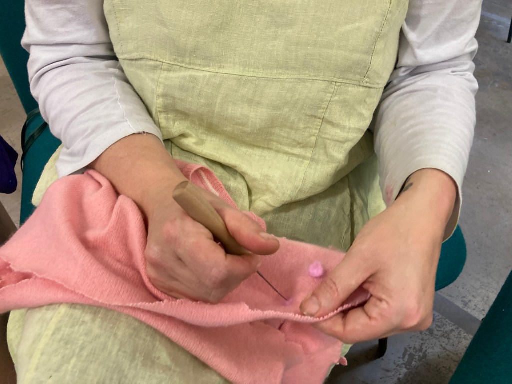 with problems over the land use at the Global Garden site, we spread our making wings to Cardiff Met in Llandaff. we met and did cloth mends with sashiko and darning, learnt knit and crochet, and finally this week we had a wool spin class in the lovely outdoor learning centre.