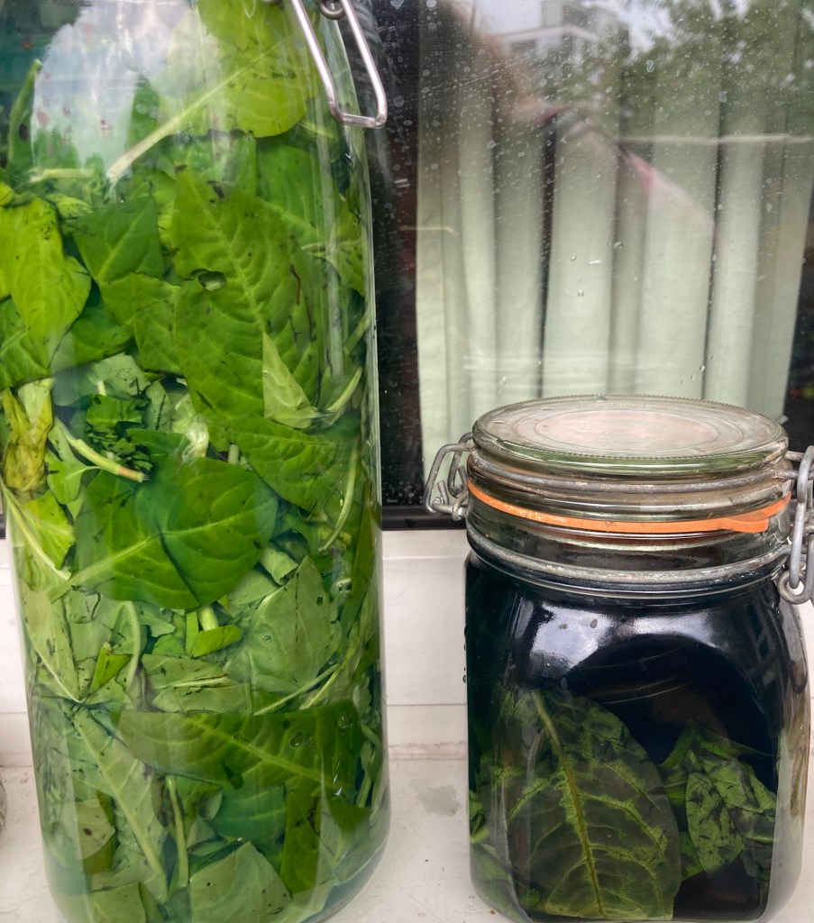 150g leaves into a 2 litre jar and filled with cold water, weighed down with a glass pot. left for 36 hours.