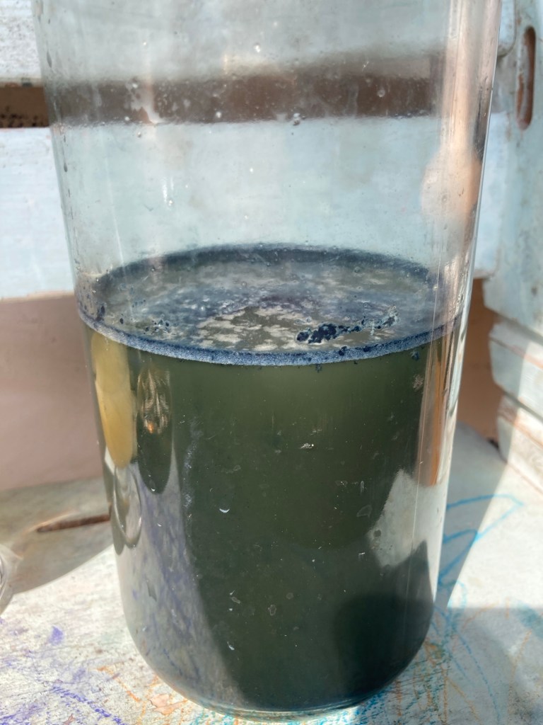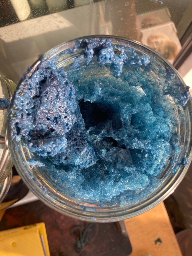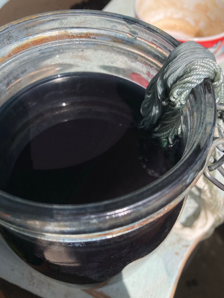 after a day, it wasn’t settling.. so added another 1/2 tsp lime and gave it another aeration. immediately there’s some signs of the indigo pigment sinking..