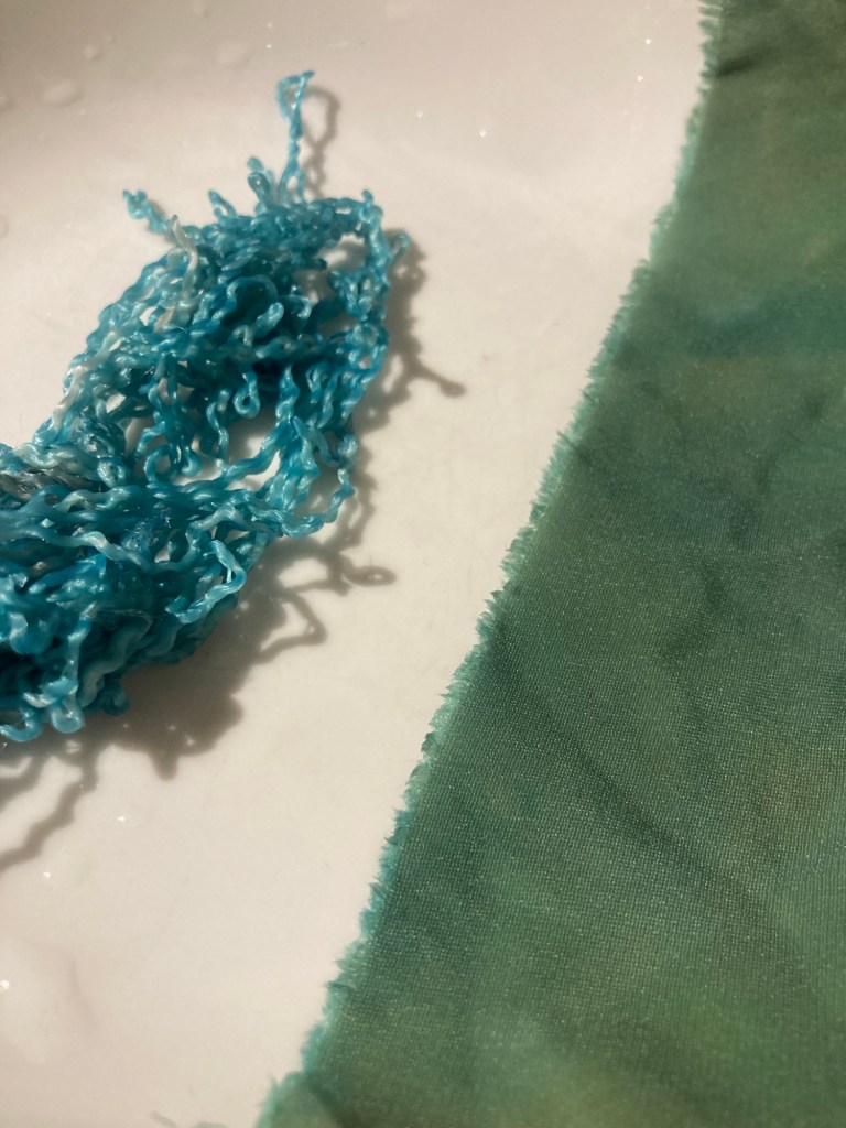 i warmed the supernatant and added a tsp fructose to reduce. it’s made lovely pale mermaid blues on linen cloth and rayon yarn, a greenish gold on silk boucle yarn and pale turquoise on silk cloth and cotton yarn.
