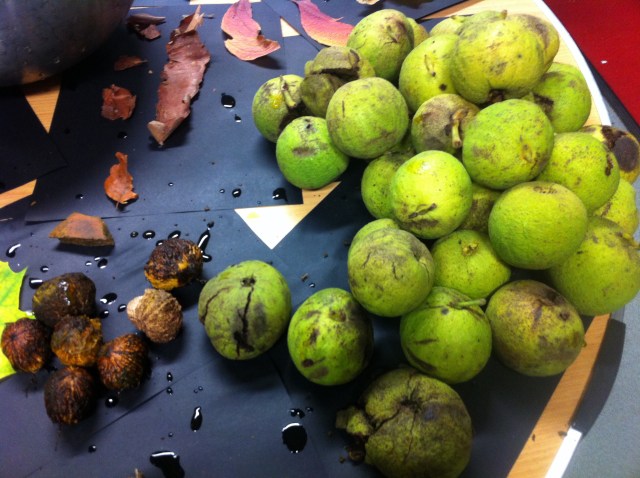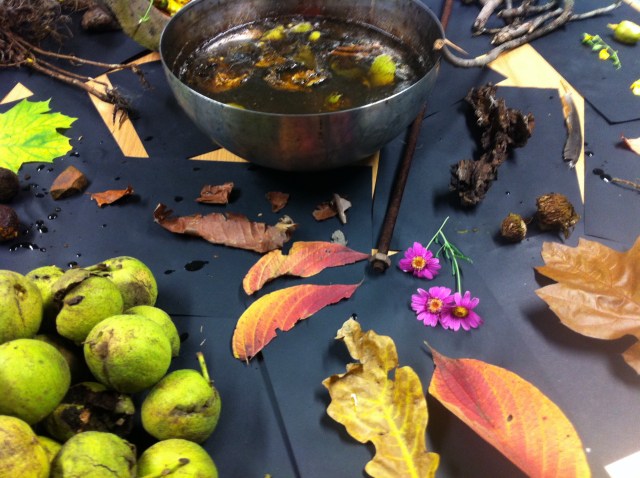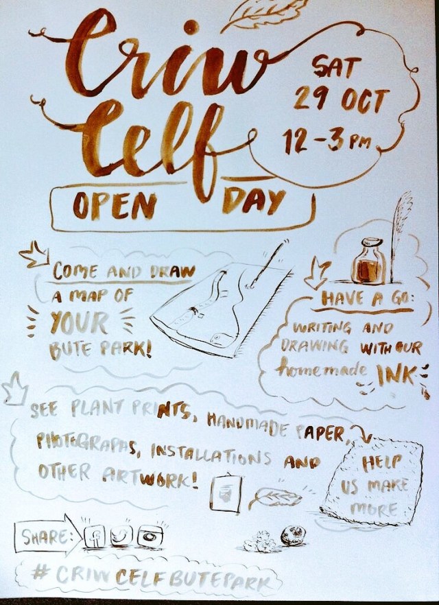 For a week in Autumn half term, I worked in Cardiff’s Bute Park, with young people and Criw Celf Cardiff. We looked, drew, collected, photographed, filmed, talked, walked, made and interacted with each other, visitors and the park. Over the week i made an inc from the gathered walnut hulls, bark, petals and leaves. Artist Laura Sorvala drew us a map of the park in the inc, which people were invited to add to.