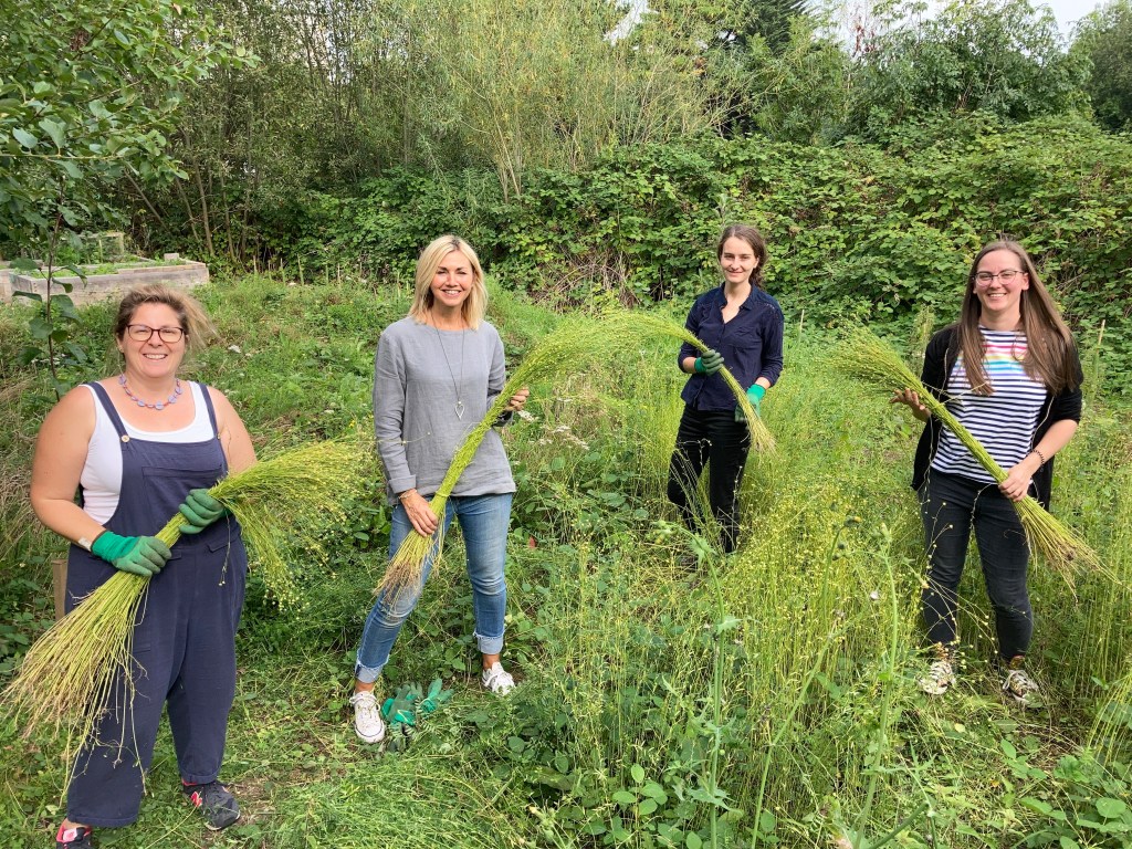 flax at flaxlands – Global Gardens 2021 the first crop. the group grew a 3m sq crop of Flax, which was harvested and processed to the first stage of linen fibre.